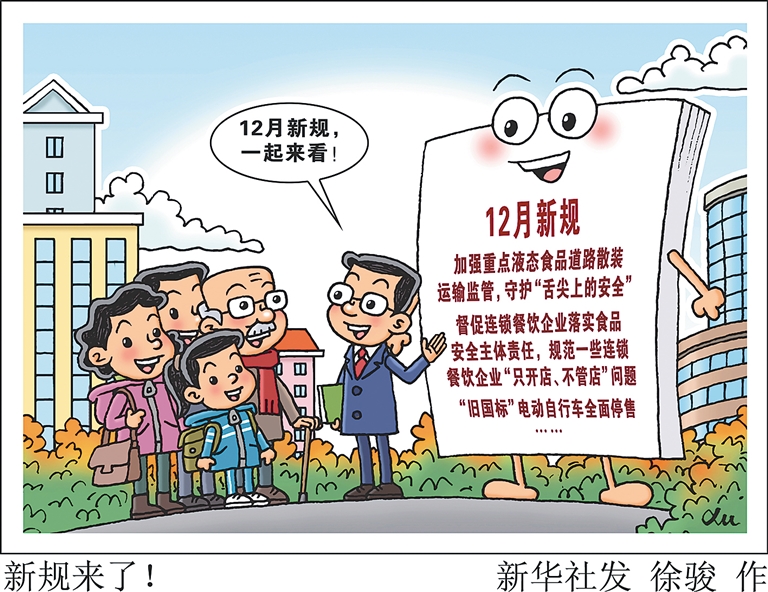 加强重点液态食品道路散装运输监管,守护“舌尖上的安全”;督促连锁餐饮企业落实食品安全主体责任,规范一些连锁餐饮企业“只开店、不管店”问题;“旧国标”电动自行车全面停售……12月新规,一起来看!
