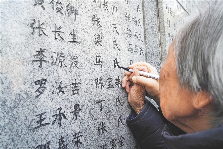 “88年了,88年了,88年了……”站在“哭墙”前,夏淑琴喃喃道。她的外孙女夏媛说:“外婆是在告诉家中亲人,又来看他们了。”1937年12月13日,夏淑琴家中9口人有7人惨遭日军杀害,时年8岁的她在身中3刀后,因昏死过去幸免于难。夏淑琴很快找到“哭墙”上亲人的名字,她用手指着名字,女儿和曾外孙则用黑笔替她为亲人的名字“描新”。