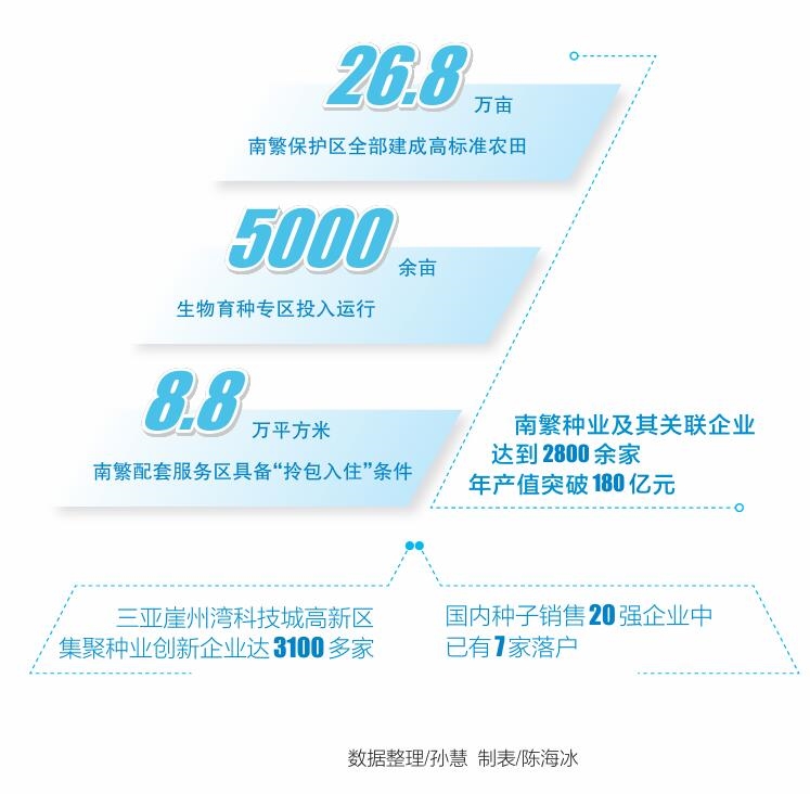 在多方推动下,26.8万亩南繁保护区全部建成高标准农田,5000余亩生物育种专区投入运行,8.8万平方米南繁配套服务区具备“拎包入住”条件,为生物育种研究试验提供有力设施保障。