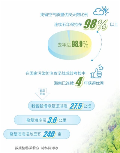 生态环境底色“向新”。我省空气质量优良天数比例连续五年保持在98%以上,去年达98.9%;地表水与近岸海域水质优良率均达“十四五”以来最优;在国家污染防治攻坚战成效考核中,海南已连续4年获得优秀。