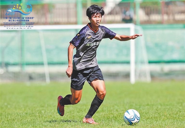 近日,海南日报全媒体记者在校园里见到高子亮时,他刚下课,背着书包匆匆走向操场准备训练。他皮肤黝黑,高鼻梁、单眼皮,目光中带着一丝腼腆,挽起裤腿后,小腿上清晰可见的肌肉线条与训练痕迹,无声地诉说着这位少年在绿茵场上的付出。