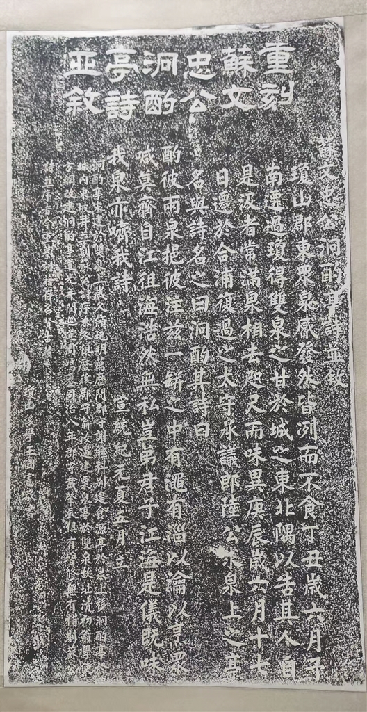 “楮墨留真——东坡文献海南金石拓片展”中的拓片制作,以保护和研究东坡金石为目的,多采用墨拓形式。展品分儋州篇、琼山篇和澄迈篇三大板块,内容包括东坡手书诗文名篇、后人写刻东坡诗文、东坡画像、历代修建东坡名胜古迹题记、历代名人访儋州东坡书院题咏等。东坡金石经传拓成拓片后,从金石载体转化为纸质载体,收藏更易集中,文字更加清晰,读者利用更加方便。