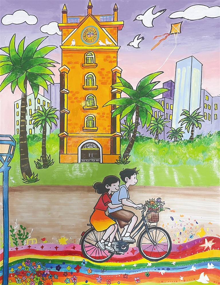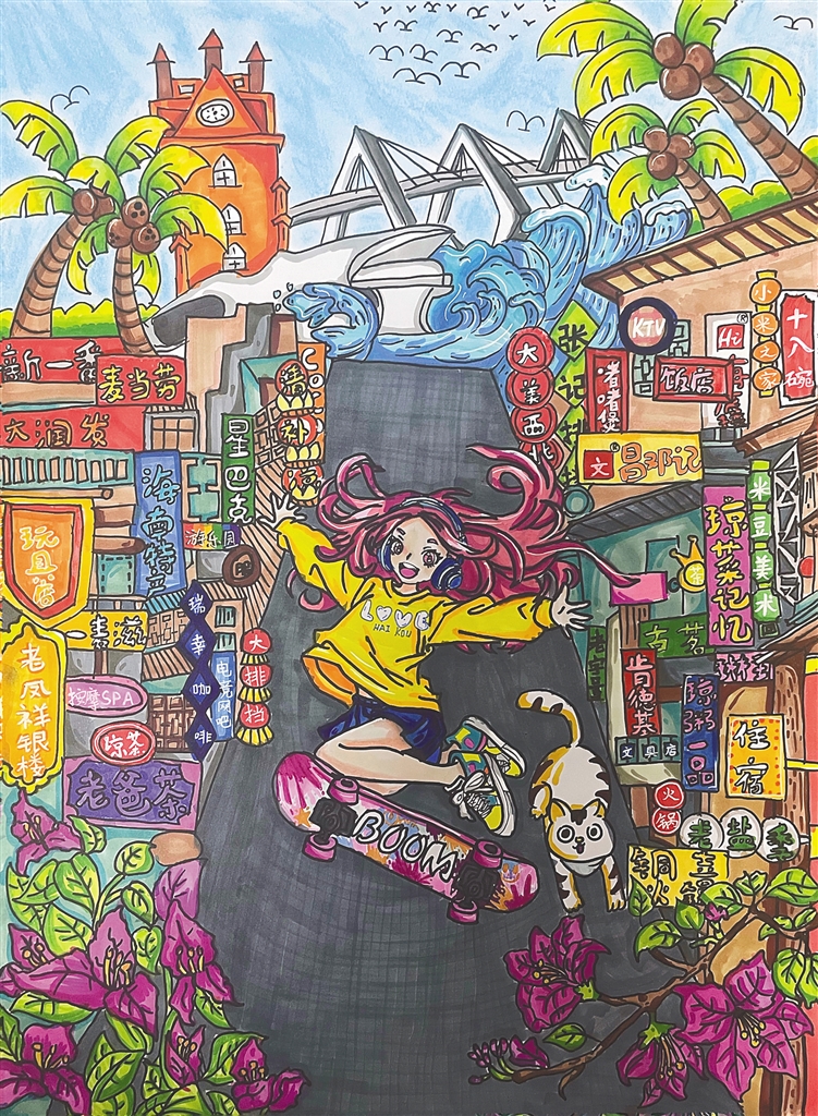 据悉,该征集活动于今年11月启动,旨在以艺术形式呈现海南自贸港的开放与发展,活动吸引全省376位青少年及艺术爱好者投稿、约28万人次参与投票评选,经作品征集、网络投票、专家评审等环节严格筛选,评选出获奖作品共计58件,最终选出50幅绘画作为“幸福潮涌·开放新章”——幸福照相馆·首日“封”主题摄影绘画展的绘画板块作品展出。