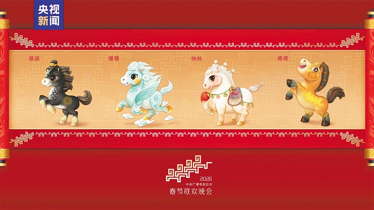 新华社北京12月18日电 中央广播电视总台12月18日发布2026年春节联欢晚会吉祥物形象——“骐骐”“骥骥”“驰驰”“骋骋”四匹骏马,与晚会主题“骐骥驰骋 势不可挡”一脉相承、相得益彰。
