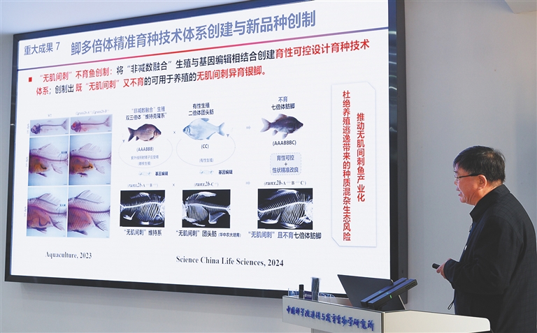 鲫鱼肉质细嫩、营养丰富,但其体内多达80余根的细小肌间刺,让许多人望而却步。我国科研人员利用“分子剪刀”,精准找到那段控制肌间刺生长的关键“代码”,并对其进行编辑,从生命源头显著减少了小刺的产生。同时,通过这套体系培育出的银鲫是可控不育的,好比安装了“生物安全锁”,避免其在自然环境中繁衍,充分考虑了生态安全。