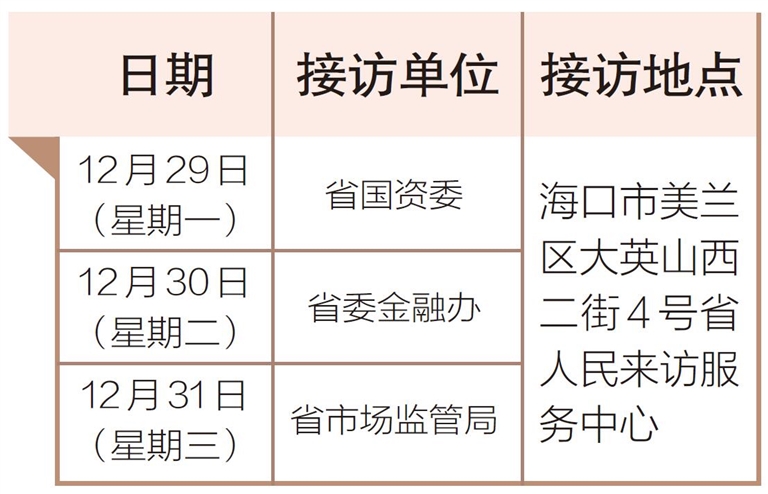12月29日至31日,省国资委、省委金融办、省市场监管局相关负责人将在海口市美兰区大英山西二街4号省人民来访服务中心接访群众。