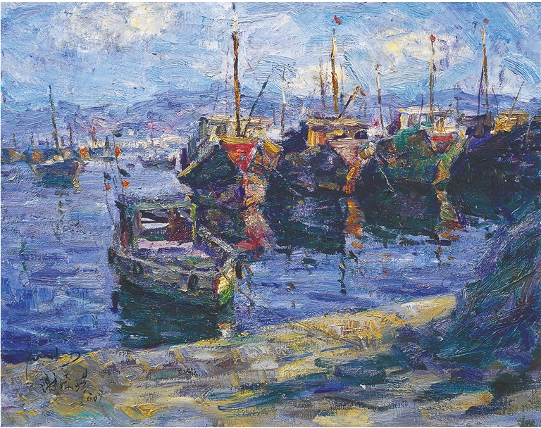 在展厅中细细欣赏一番后,谢源璜的好友、中国美术家协会会员、广州美术学院绘画学院油画系二级教授郭润文提出,谢源璜对色彩的把控炉火纯青,其作品既有玉石般的温润,又透着甜蜜。而其作品的最大特征就是需要站在一定的距离欣赏。“他利用色彩的斑驳和补色关系产生光和造型的感觉。当我们后退一定距离,所有的体积关系、空间关系就都呈现出来了。”他说。