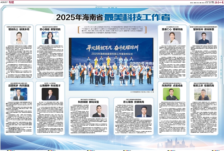 2025年12月30日晚,由海南省科学技术协会、中共海南省委宣传部、海南省科学技术厅联合主办的,以“平凡铸就不凡 奋斗光耀琼州”为主题的2025年海南省最美科技工作者发布仪式在海口市融媒体中心1号演播厅举行。鱼欢、李辉、叶世阳、李诚、李川、张成亮、王改青、张汉宁、赵子方、唐清杰等10位科技工作者被授予2025年海南省最美科技工作者荣誉称号,获颁荣誉证书和奖杯。