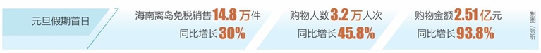 本报海口1月2日讯(海南日报全媒体记者曹马志 通讯员童子杨)政策利好叠加封关效应,海南离岛免税消费市场假期迎来一波热潮。海口海关1月2日公布数据,1月1日元旦假期首日,海南离岛免税销售14.8万件,同比增长30%;购物人数3.2万人次,同比增长45.8%;购物金额2.51亿元,同比增长93.8%。