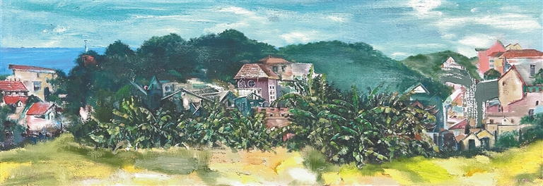 前不久,三亚市文化馆举办了一场“山海双叙——孟殷、黄超艺术联展”。展厅内,一幅名为《小岛的夏天》的作品吸引了不少观众驻足欣赏。画中,绿树掩映下的房屋伫立,远眺无垠的大海,阳光透过枝叶洒下斑驳光影,仿佛能听见海风轻拂的声音。