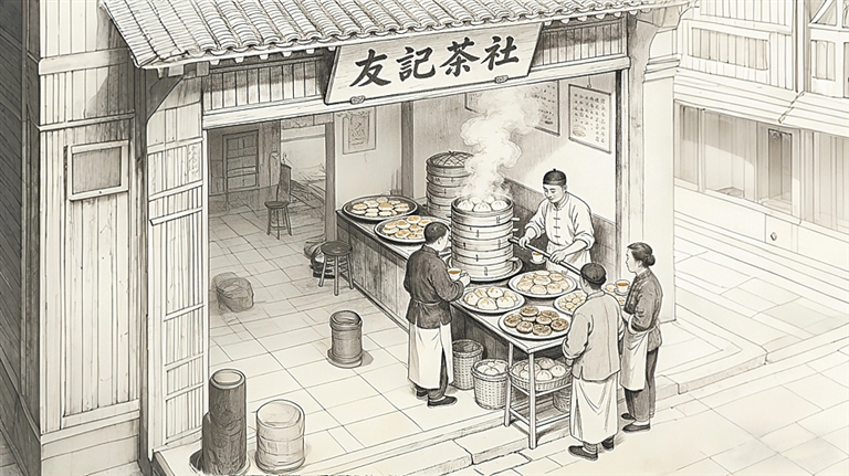 《海南岛记》中也记载,海口的“茶馆也相当多。我们多次到友记茶社喝茶、吃点心。新式糕点一个十钱,各式各样的点心用大盘子端上来,把冒着热气的馒头蒸笼抬上来。可以选自己喜欢的品种吃……”