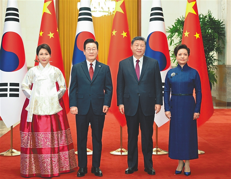 会谈前,习近平和夫人彭丽媛在人民大会堂北大厅为李在明和夫人金惠景举行欢迎仪式。