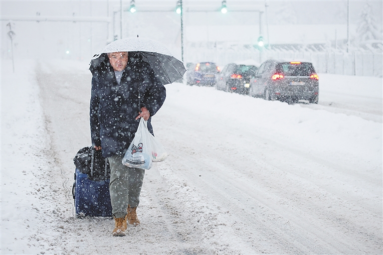 受寒潮带来的强降雪影响,近日欧洲多地的空中、地面和轨道交通严重受阻。荷兰阿姆斯特丹史基浦机场大量航班取消,阿姆斯特丹周边列车停运。巴黎地区的两大机场起降航班缩减,地面多条公交线路停运。图为一名男子在波黑首都萨拉热窝街头冒雪行走。新华社/路透