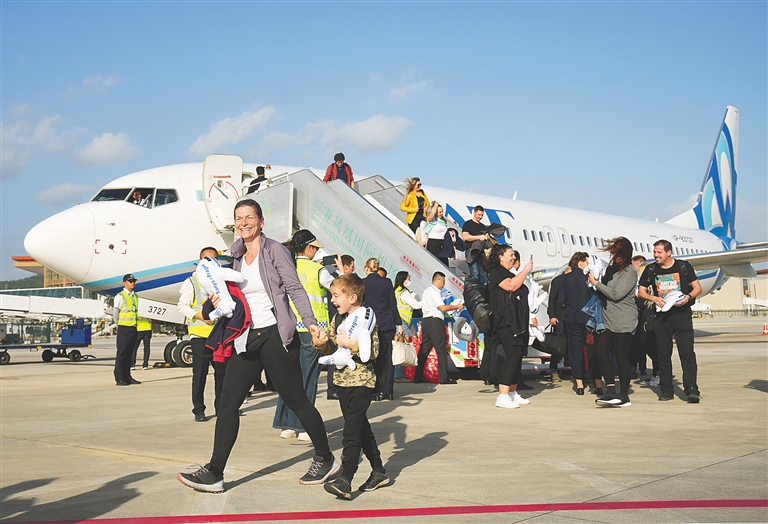 海岛阳光正好,捷克旅客一出机舱门就感受到了冬日三亚的异域风情,忍不住互相拍照留念。“以前如果要来海南,我们得先去中东的机场中转,花的钱更多,耗时也更长。”捷克旅客维罗妮卡开心地说,这趟直飞航班让她可以“说走就走”。