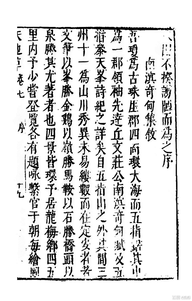 王弘诲来自海南定安县,他笔下的家乡山水美如画。书中《南溟奇甸集叙》一文有云:“吾琼为古珠崖郡,四面环大海,而五指踞其中,为一郡领袖。……山川秀异,未易缕数。而在定安者,若文笔以峰胜,金鸡以岭胜,马鞍以石胜,桥头以泉胜,其尤著者也。四景皆环予居龙梅乡四五里内。”王弘诲命名的定安四景,分别是文笔峰、金鸡岭、马鞍冈、桥头溪。