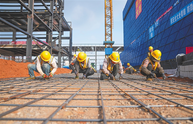 1月12日,海南国际智慧物贸云港项目建设现场,上百名工人正加紧施工。图为工人在绑扎钢筋。