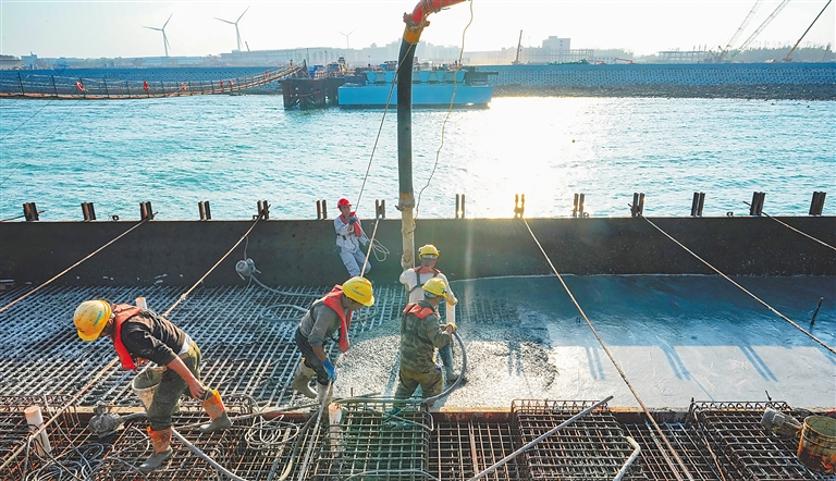 近日,在临高金牌港开发区港口及配套工程项目一期工程现场,施工人员加紧推进码头引桥主墩建设,施工场面如火如荼。