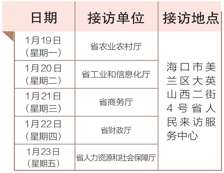 1月19日至23日,省农业农村厅、省工业和信息化厅、省商务厅、省财政厅、省人力资源和社会保障厅相关负责人将在海口市美兰区大英山西二街4号省人民来访服务中心接访群众。