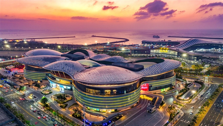 | 1月4日晚,海口国际免税城灯火璀璨,“九州祥云,南海之冠”的建筑设计在灯光映照下更显灵动飘逸。海南日报全媒体记者 陈元才 摄 |