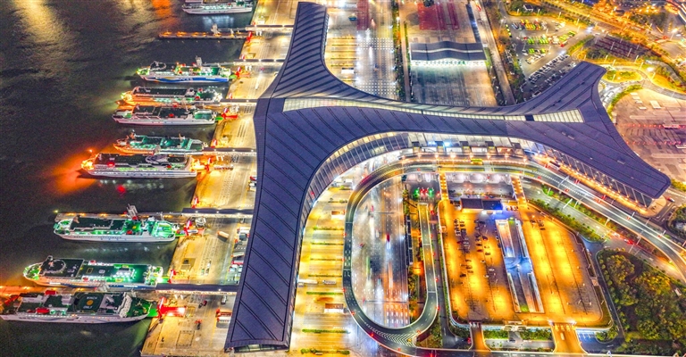 | 1月4日晚,海口市新海港码头灯火通明,客滚船有序进出港,一派繁忙景象。海南日报全媒体记者 陈元才 摄 |