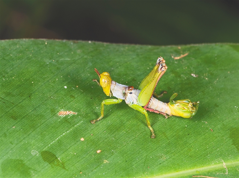 按照昆虫的通用形态特征,成虫通常具备“一对触角、二对翅和三对足”的“一、二、三”标配,但海南华穆蜢却走出了独特的演化路径。“海南华穆蜢是迄今为止发现的唯一一种前翅为鳞片状微型翅的蜢,它的翅膀很小,属于微翅型,这是演化的结果。”杨梓煊说。