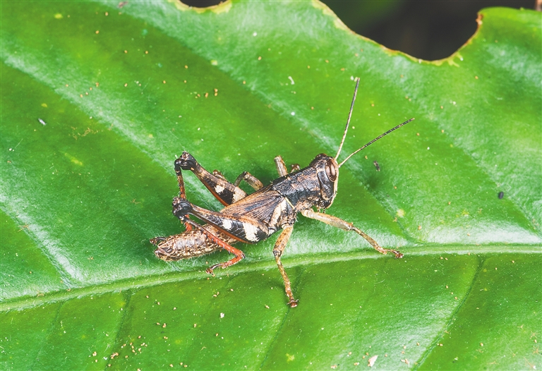 “这也是我们去年发表的一个新种。”杨梓煊提到,这种蝗虫没有鲜艳的体色,外形朴素无华,却能完美融入灌丛、落叶堆环境。在海南各大山脉的角落里,都有机会找到黄氏琼蝗的身影。
