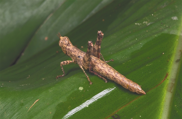 2023年7月,昆虫爱好者杨梓煊和师兄在黎母山进行野外研究采样,有一天他们在山上“刷夜”,走在海拔六七百米的一条雨林岔路上时,偶遇了一只趴在灌木叶片上“睡觉”的蜢科昆虫雌虫。“当时就觉得这只小虫子很特别,是个‘潜力股’,特意多留了个心眼。”杨梓煊回忆。