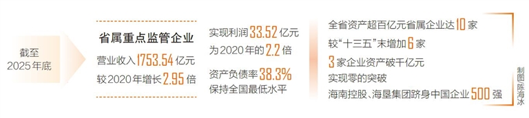 “十四五”期间,海南省属企业规模效应同步显现。全省资产超百亿元省属企业达10家,较“十三五”末增加6家;3家企业资产破千亿元,实现零的突破;海南控股、海垦集团跻身中国企业500强。
