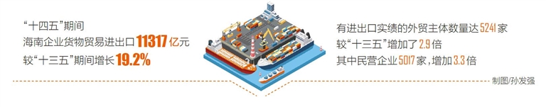 经营主体活力迸发,民营企业成外贸主力军。“十四五”期间,海南货物贸易主体数量持续攀升,有进出口实绩的外贸主体数量达5241家,较“十三五”增加了2.9倍。其中,民营企业5017家,增加3.3倍;进出口6706.9亿元,增长32.9%,占全省进出口总额的59.3%,所占比重较“十三五”提升了34.1个百分点。