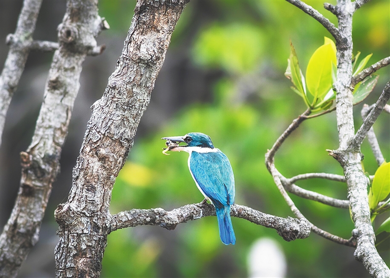 “快看,它抓住一只小螃蟹了。”2025年12月17日,在海口北港岛红树林边的防潮大堤上,来自山东的韩懿一边按动着快门,一边招呼同行伙伴赶紧移动机位。去年9月底,迷鸟白领翡翠飞抵北港岛,原本以为休整几天就会消失,不承想它至今还未有离去的想法。这只不想离开的白领翡翠,不到三个月的时间,已为北港岛带来数千名观鸟爱好者,他们来自四面八方,有来自北京、天津的,也有来自四川、云南、山东等地的。
