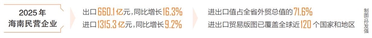 据统计,在全省外贸中,海南民营企业货物贸易进出口值从2018年的160亿元,增长到2025年的近2000亿元。其中,2025年全省有进出口实绩的企业中,民营企业占比超八成,进出口值占全省外贸总值的71.6%,连续6年稳居海南外贸第一大主体地位。