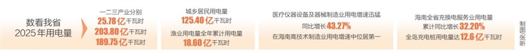 数据显示,2025年海南省第一、第二、第三产业和城乡居民用电量分别达25.78亿千瓦时、203.80亿千瓦时、189.75亿千瓦时和125.40亿千瓦时,同比增长分别达9.16%、4.16%、3.99%和7.02%。