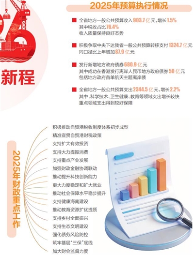 2025年,海南财政以攻坚之势,支持自贸港如期封关运作;以靶向之准,提高积极财政政策质效;以政策之力,支持培育经济发展新动能;以民生之暖,增强人民群众获得感;以风控之稳,防范化解重点领域风险。