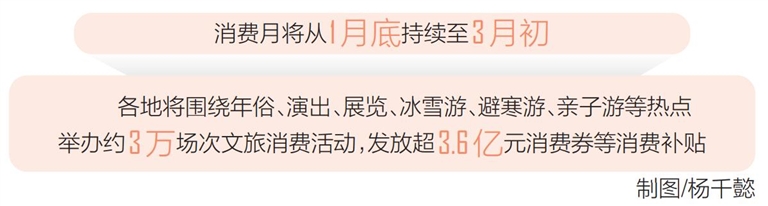 消费月将从1月底持续至3月初,其间各地将围绕年俗、演出、展览、冰雪游、避寒游、亲子游等热点,推出丰富多彩的应季文旅产品和活动,举办约3万场次文旅消费活动,发放超3.6亿元消费券等消费补贴,推出门票减免、票根联动优惠、跨区域文旅优惠等举措,加大直达居民游客的普惠政策力度,为人民群众欢度新春提供更多文旅选择。