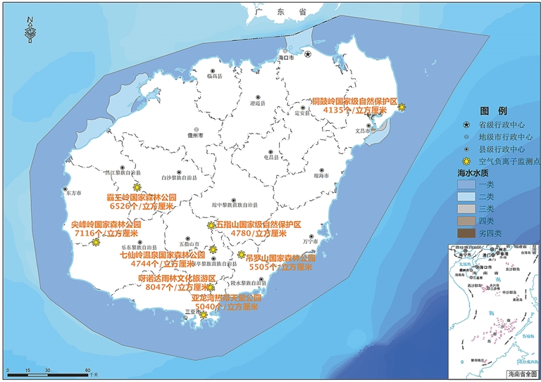 全省主要森林旅游区空气负离子浓度处于较高水平,霸王岭空气负离子平均浓度为6526个/立方厘米、尖峰岭为7116个/立方厘米、五指山为4780个/立方厘米、七仙岭为4744个/立方厘米、铜鼓岭为4135个/立方厘米、吊罗山为5505个/立方厘米、呀诺达为8047个/立方厘米、亚龙湾为5040个/立方厘米,均优于世界卫生组织规定清新空气1000~1500个/立方厘米的标准,对人体健康有利。