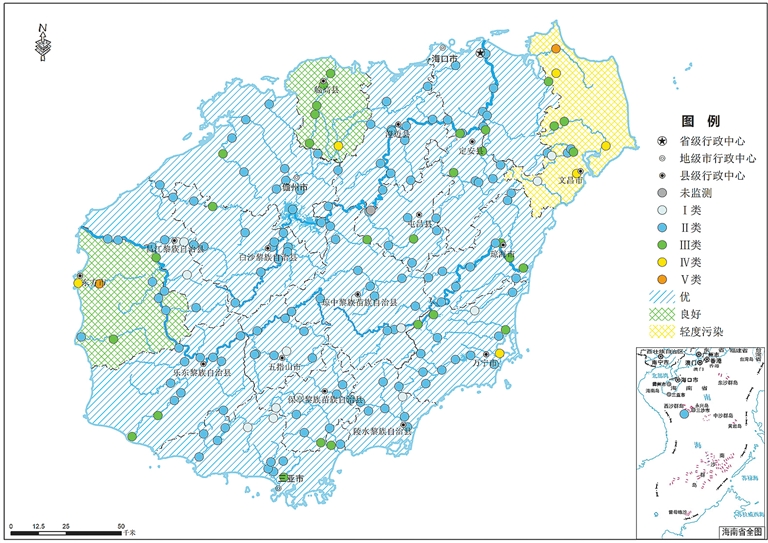全省地表水水质总体为优,192个1省控监测断面(点位)水质达到或好于Ⅲ类比例为95.8%,同比下降1.1个百分点;无劣Ⅴ类断面,同比持平。19个市县中,文昌市水质轻度污染,东方市、临高县水质良好,其余市县水质为优。