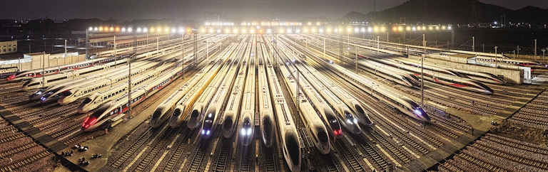 将时间尺度拉长,由北京看向全国——我国铁路总里程由1949年的2.2万公里延长到现在的16.5万公里、高铁里程突破5万公里;慢悠悠的绿皮火车发展为舒适便捷的红皮车、蓝皮车,乃至向更快的“复兴号”高铁动车组列车“进化”……