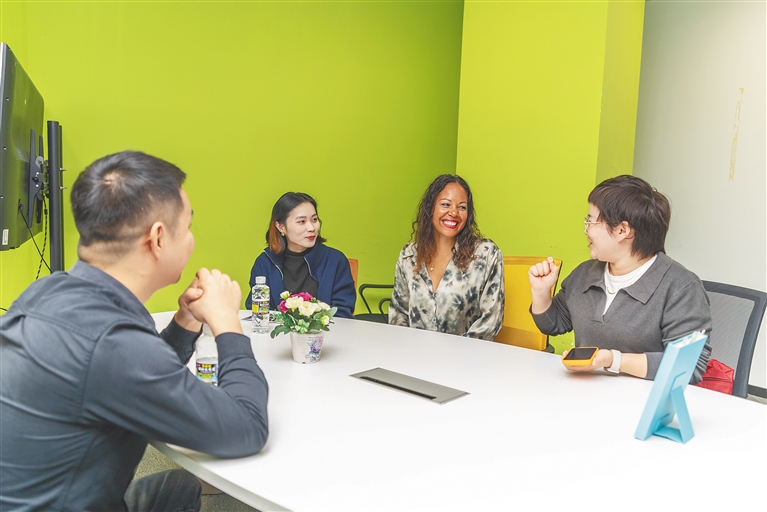 近日,在海口复兴城互联网信息产业园,来自比利时的卡罗(右二)在和园区企业有关人员交流。