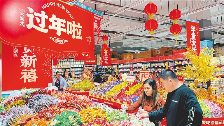 农历马年春节将至,海口许多超市通过打造“一站式”年货购物体验,满足市民多元化消费需求,椰城年味正浓。2月3日,海口市大润发超市年货大街红火开街,洋溢着喜庆祥和的节日氛围。货架上各色礼盒、干果特产琳琅满目,市民们穿梭其间精心挑选年货,现场人头攒动、购销两旺。海南日报全媒体记者 张茂 实习生 柳一诺 摄