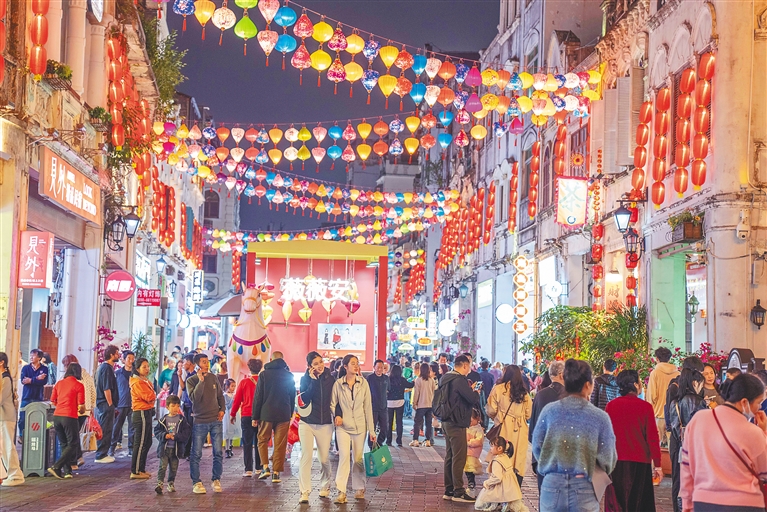 近日,海口骑楼老街夜晚灯火璀璨,年货节活动氛围浓厚,市民游客纷纷前来打卡感受年味。据了解,本次年货节吸引百余家商户入驻年货街,品类涵盖零食糖果、腊味干货、节日装饰等,本地商户还备足海南特色伴手礼,搭配试吃、手作体验等活动,丰富消费体验。海南日报全媒体记者 李天平 摄