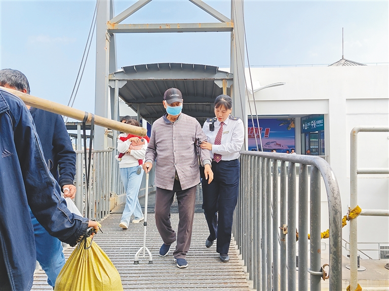 准备工作就绪,登船梯口人流渐增。“请大家有序排队,注意脚下安全。”刘霞的声音温和又有力,目光始终在人群中穿梭。看到一位拄拐老人步履艰难,她立刻上前搀扶,一路护送至座位,轻声叮嘱航程中有事随时招呼。这样的暖心呵护,在她19年的职业生涯里,早已成为刻在骨子里的习惯。