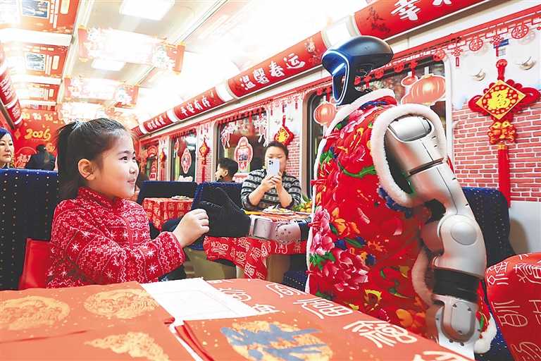 2月13日,在黑龙江齐齐哈尔开往北京的T48次列车上,哈尔滨铁路部门连续二十年举办的列车“春晚”如约而至。在多样的节目中,两个仿生机器人成为全场焦点,旅客沉浸在列车“春晚”温馨氛围的同时,也感受到了年味中满满的科技感。