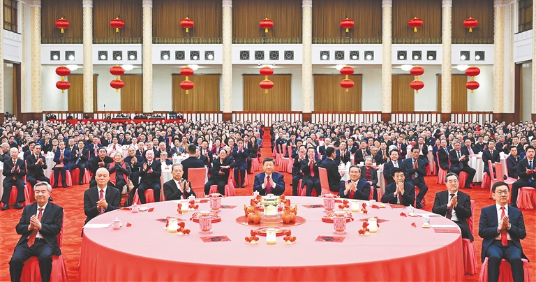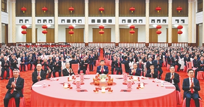 人民大会堂宴会厅灯光璀璨、喜气洋洋,各界人士2000多人欢聚一堂、共迎佳节,现场洋溢着欢乐祥和的节日气氛。