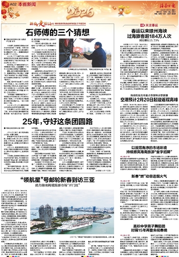 本报海口2月17日讯 (海南日报全媒体记者曹马志 通讯员方旭霞)2月17日,海南日报全媒体记者从海口海事局获悉,春运以来截至2月16日20时,海事部门累计安全保障进出港客滚船(含平板驳船)4967艘次,运输旅客184.03万人次,车辆45.02万辆次,分别同比增长8.17%、15.73%、13.49%。