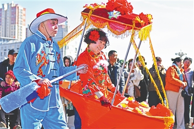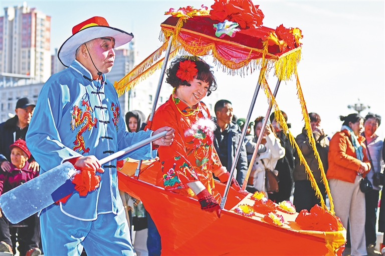 ③在山东烟台黄渤海新区万达广场,民间艺人表演海阳大秧歌。