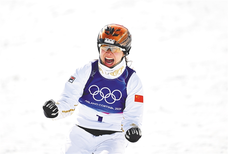 当地时间2月18日,在米兰-科尔蒂纳冬奥会自由式滑雪女子空中技巧决赛中,中国选手徐梦桃获得冠军。图为徐梦桃在决赛中庆祝。本栏图片均由新华社发