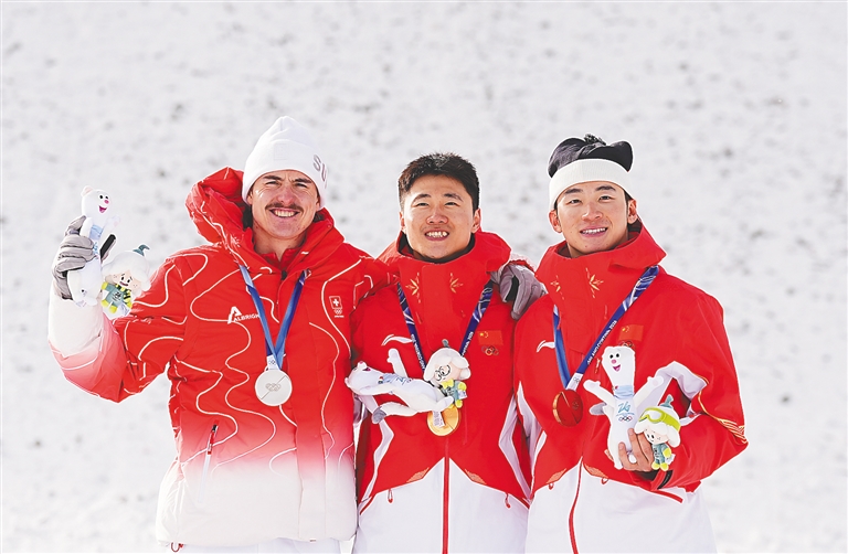 当地时间2月20日,在意大利利维尼奥举行的米兰-科尔蒂纳冬奥会自由式滑雪男子空中技巧决赛中,中国选手王心迪和李天马分获冠军和季军。