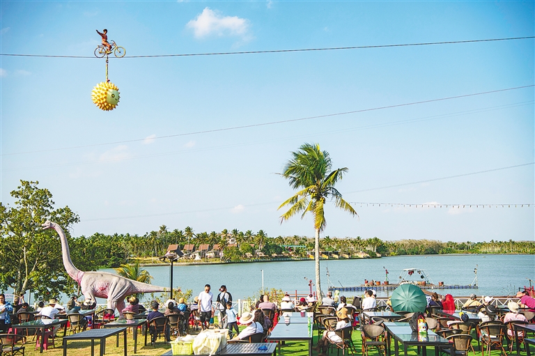春节期间,琼海世界热带水果之窗景区湖滨休闲区上空,惊险刺激的高空钢丝表演精彩上演,勇气与技艺交织成一曲“空中芭蕾”,吸引许多游客前来观赏。