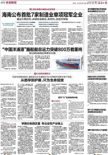 据悉,制造业单项冠军企业是制造业高质量发展的重要支撑,也是自贸港建设中产业链强链稳链固链的关键力量。此次首批省级制造业单项冠军企业的出炉,将进一步激发海南制造业企业的创新活力,推动更多企业向专精特新方向发展,助力海南加快构建现代化制造业产业体系,为自贸港建设筑牢产业根基。
