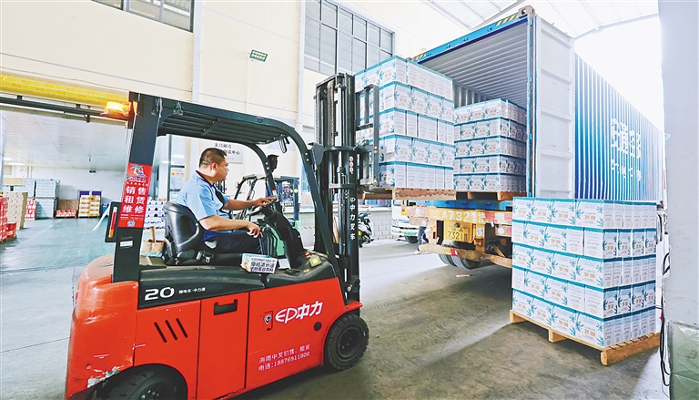 图为工作人员将椰奶产品装运上车,发往全国各地。